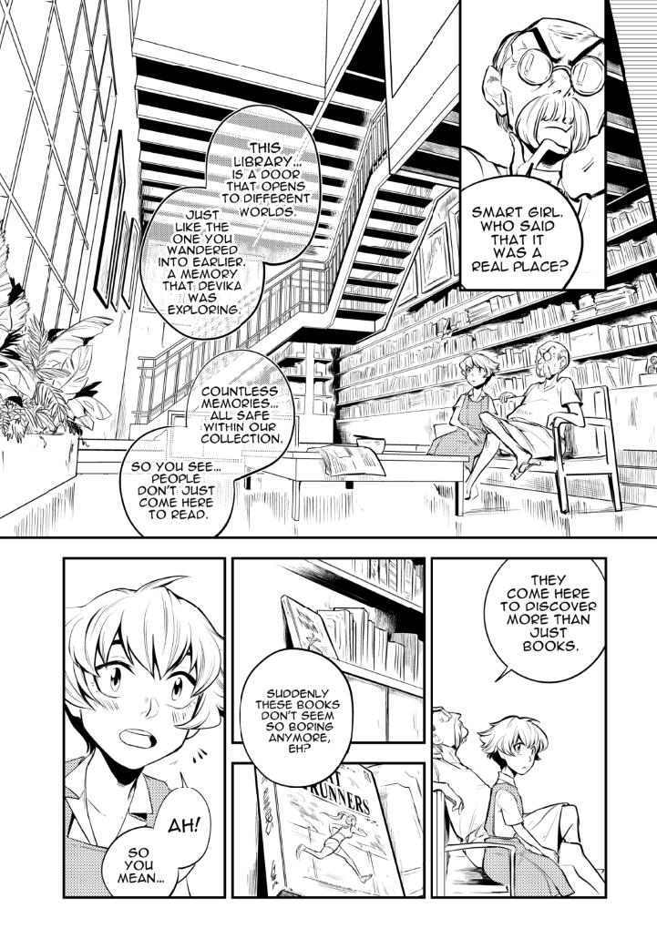 A young girl stumbles upon a mysterious library that allow her to explore memories and stories within its collections.